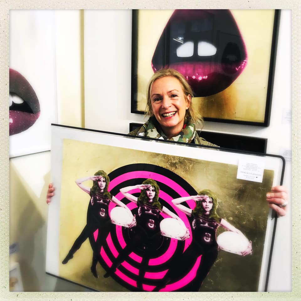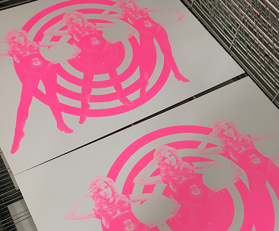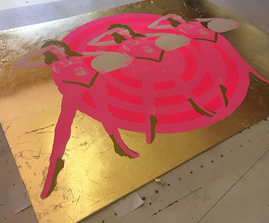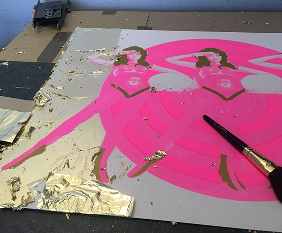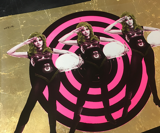 Barbarella 2018 3 colour screen print plus gold on 580 gsm screen printing cardboard Artist prints / signed. dated. handstamped and -embossed. handprinted with ♥ by the artist 60 x 80 cm Similar Work TESTBILD NO 3 Königsdisziplinen Edition 2 – 2012 Ein Teil von der Welt mehr