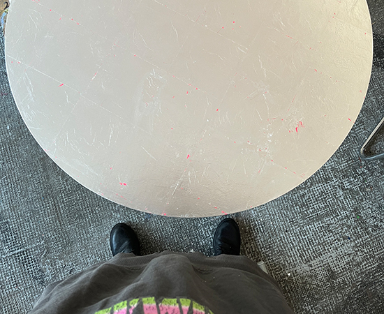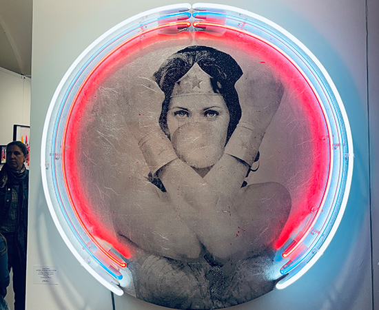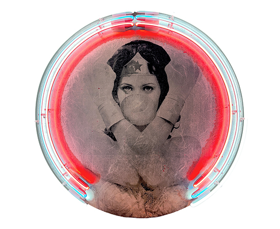 BUBBLE HEROINE NEON BIG 2024 1 colour screen print on wood hand finished with silver Neon glas white/blue/red Unikat. signed. dated. handprinted with ♥ by the artist 85 cm Similar Work LIPS Königsdisziplinen Edtion 1 – 2006 LIPS IRIS