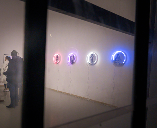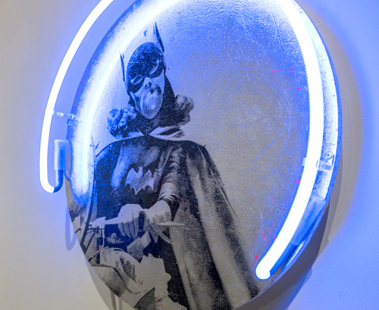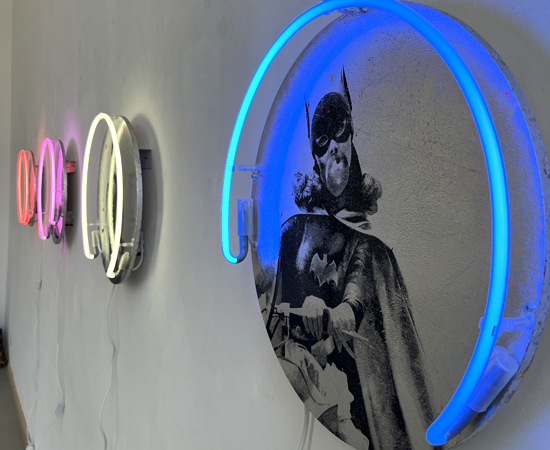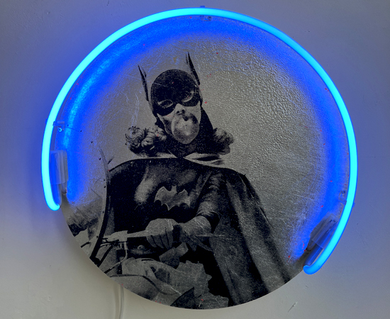 BUBBLE HEROINE NEON super blue 2023 1 colour screen print on wood hand finished with silver Neon glas super blue Unikat. signed. dated. handprinted with ♥ by the artist 46 cm Similar Work BUBBLE KISS pink BUBBLE HEROINE NEON BIG Triple