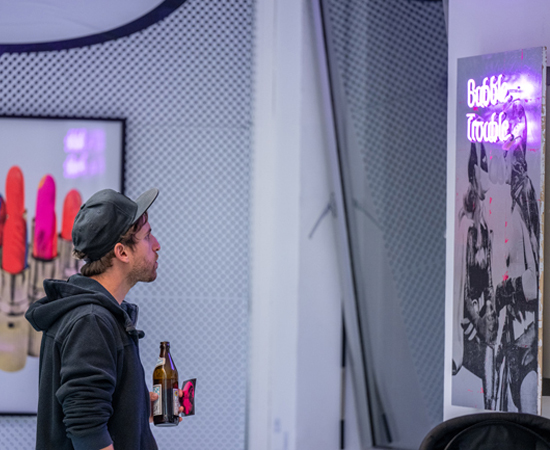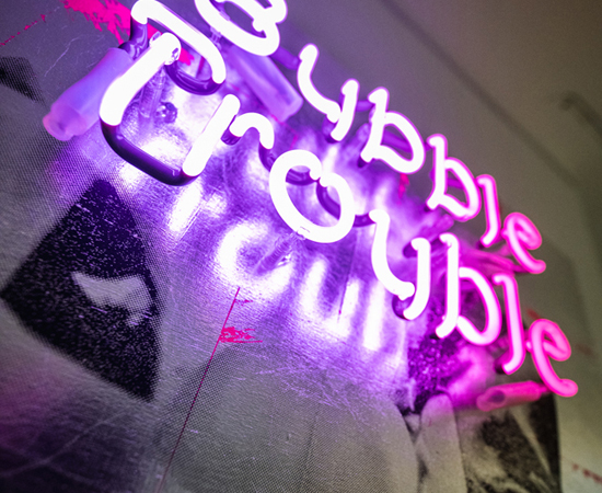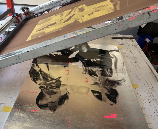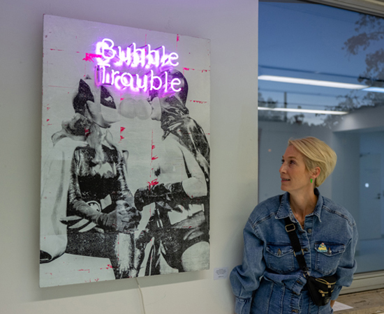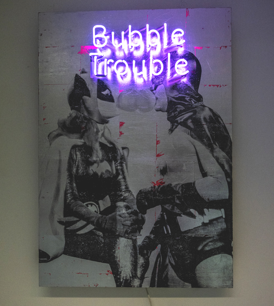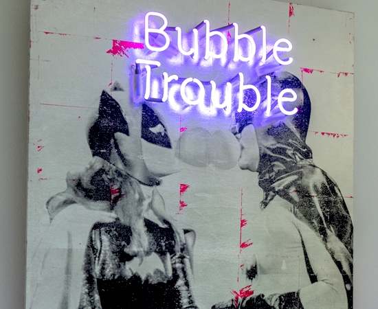 BUBBLE KISS Neon 2022 1 colour screen print on wood hand finished with silver, Neon letters Unikat. signed. dated. handprinted with ♥ by the artist 70 x 100 cm Similar Work MIAU Multicolour 2 GANESHA GOOD KARMA DUBBLE BUBBLE pink