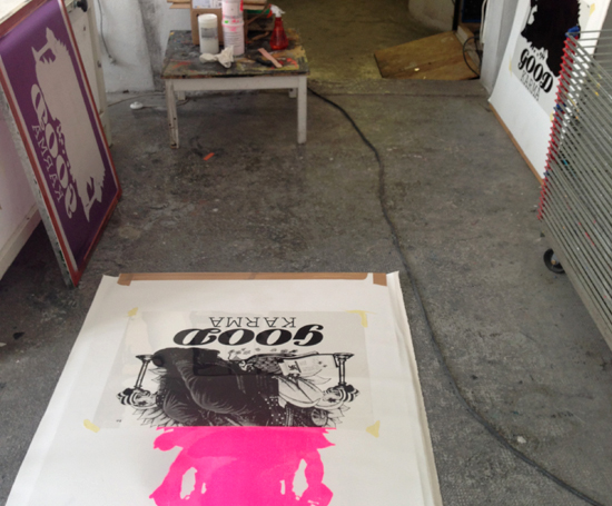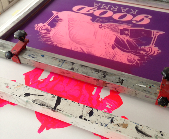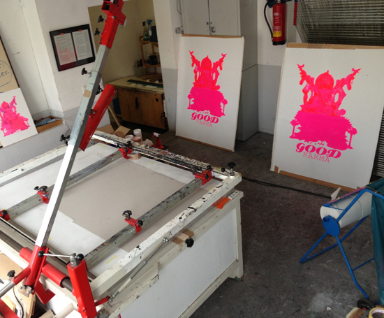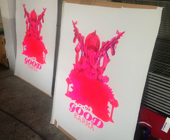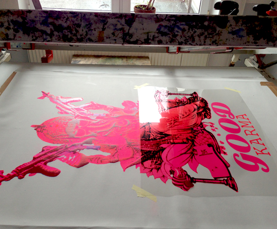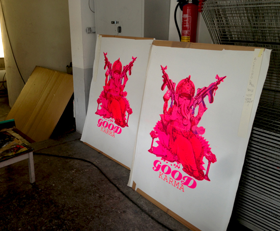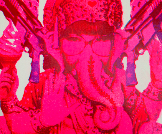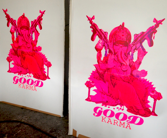 GANESHA GOOD KARMA CANVAS GANESHA Good Karma 2016 3-colour neon screen print on canvas handprinted with ♥ by the artist 130 x 90 cm Similar Work BUBBLE HEROINE NEON white Barbarella BETTER BE GOOD MULTICOLOUR
