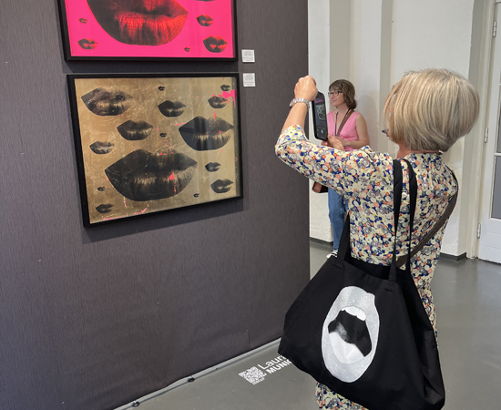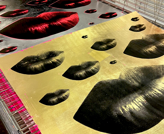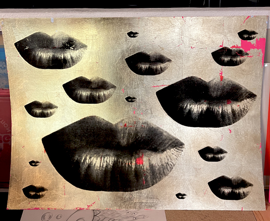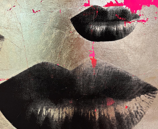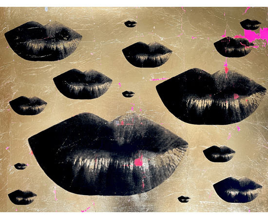 LIPS Allover Gold / Silver 2022 2 colour screen print on on 580 gsm screen printing cardboard hand finished with gold / silver. Unikat / signed. dated. handstamped and -embossed. handprinted with ♥ by the artist 60 x 80 cm Similar Work BETTER BE GOOD MULTICOLOUR Triple Analog Alphabet