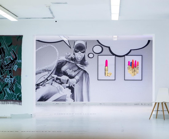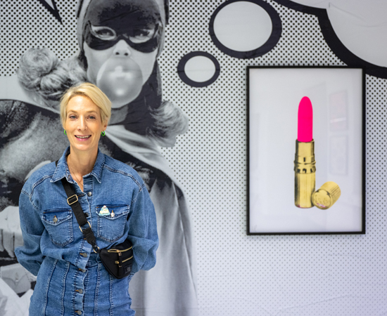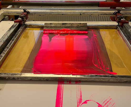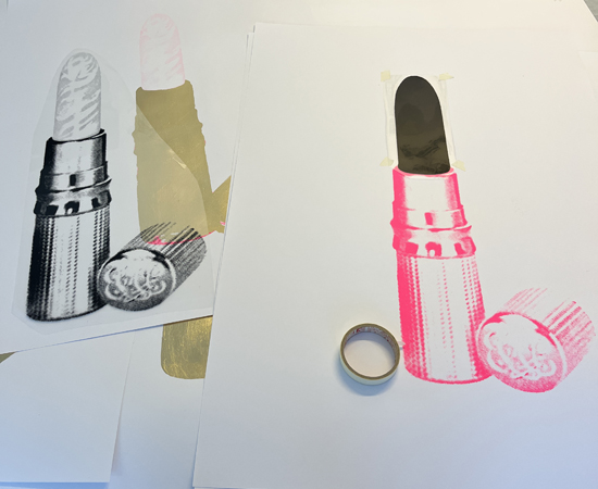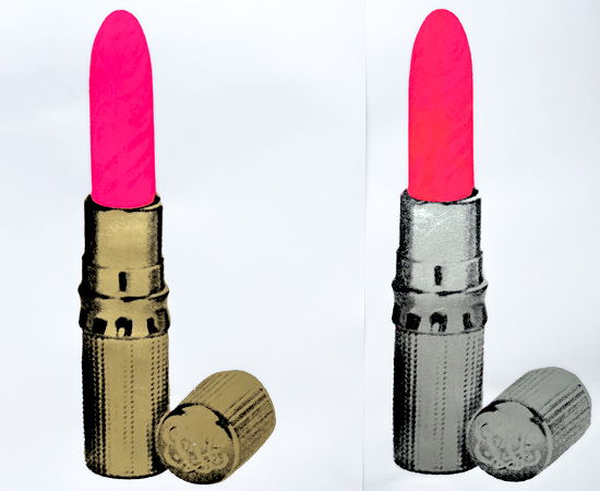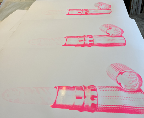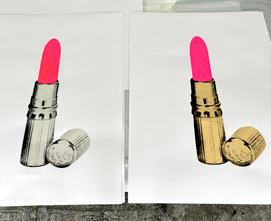 LIPSTICK Gold / Silver 2022 2 colour neon screen print on 300 gsm Gmund carton hand finished with gold / silver Unikate / various colours. signed. dated. handstamped and -embossed. handprinted with ♥ by the artist 70 x 100 cm Similar Work GANESHA GOOD KARMA CANVAS Testbild No 1 Königsdisziplinen Edition 2 – 2012