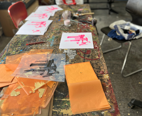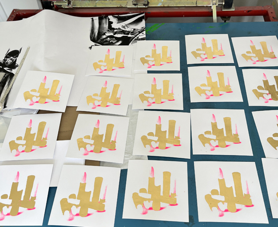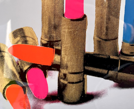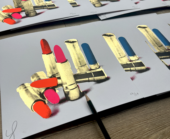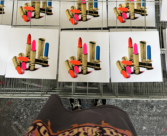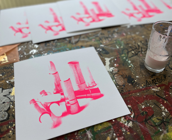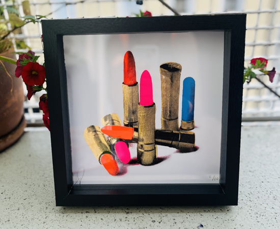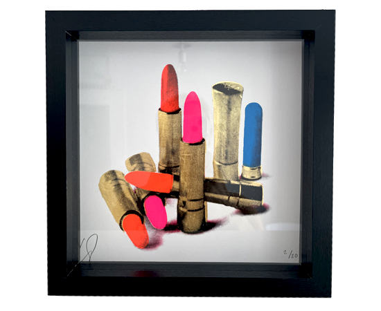 LIPSTICKS Mini 2023 5c neon screen print on 300 gsm Gmund carton hand finished with gold Strictly limited Edition of 20 / signed. dated. handprinted with ♥ by the artist 23 x 23 cm Similar Work D`WUIDARA WUNDERTUETE PARADE canvas BUBBLE HEROINE pink