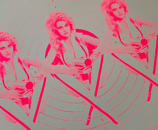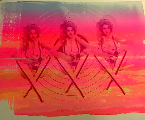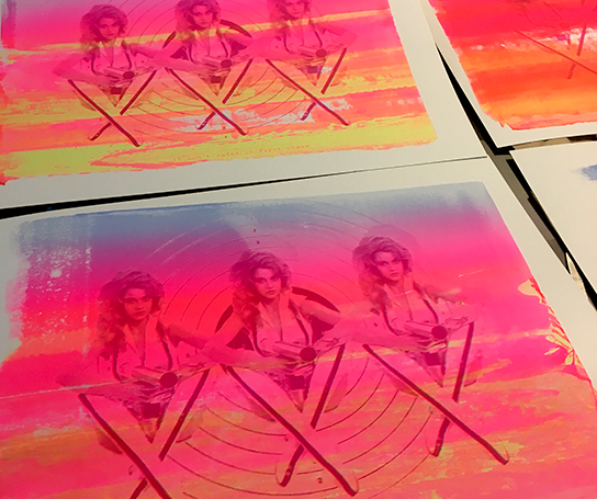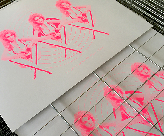 Triple Triple 2017 Multicolour neon screen print on 380 gsm Bristol carton Strictly limited Edition/ Artist Prints signed. dated. handstamped and -embossed. handprinted with ♥ by the artist 60 x 80 cm Similar Work BUBBLE HEROINE NEON super blue GANESHA GOOD KARMA CANVAS TESTBILD NO 3